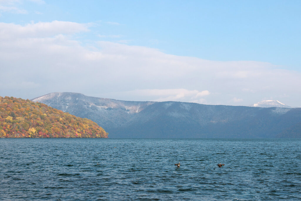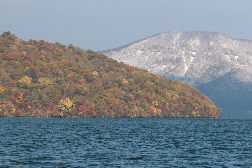 今朝(10/29)の十和田湖畔です。十和田湖を囲む外輪山に雪が降りました。