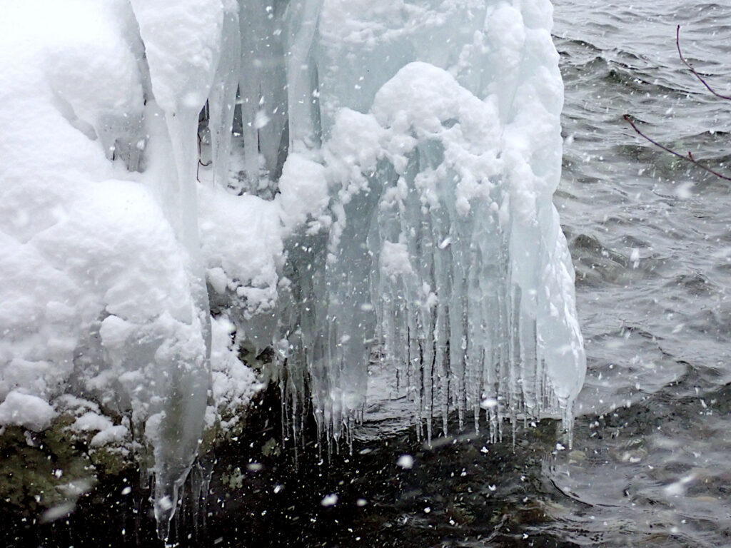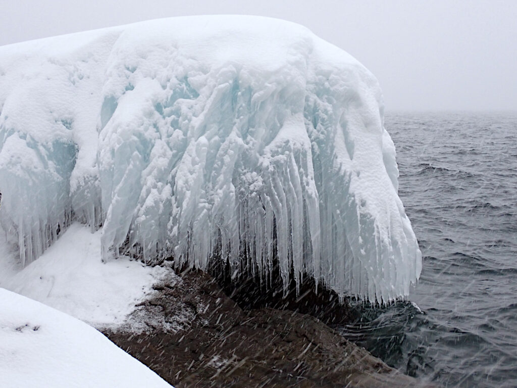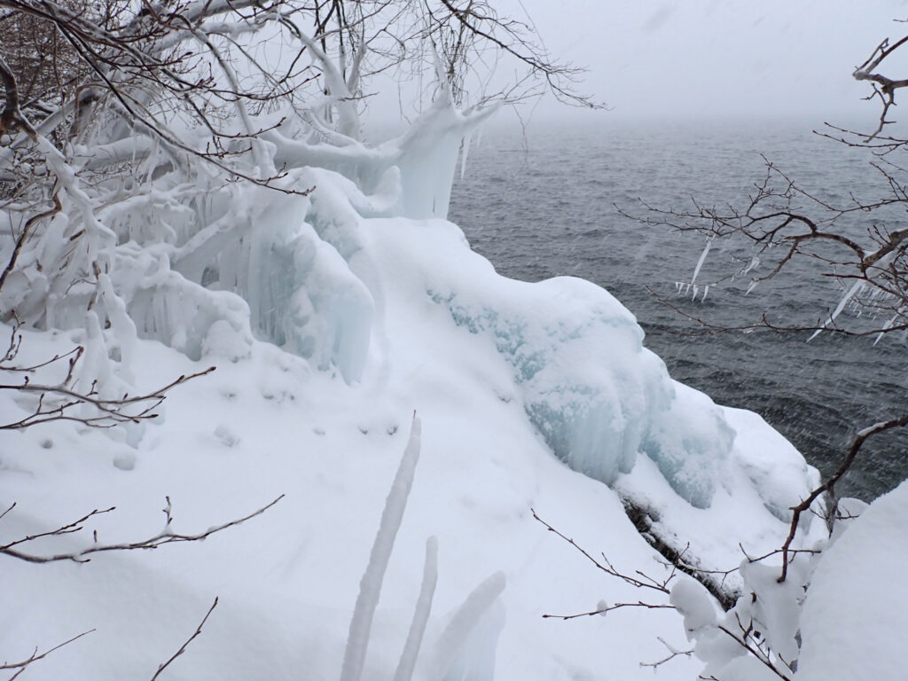 樹木や岩にかかった波しぶきが凍って出来る、厳寒期の風物詩です。
