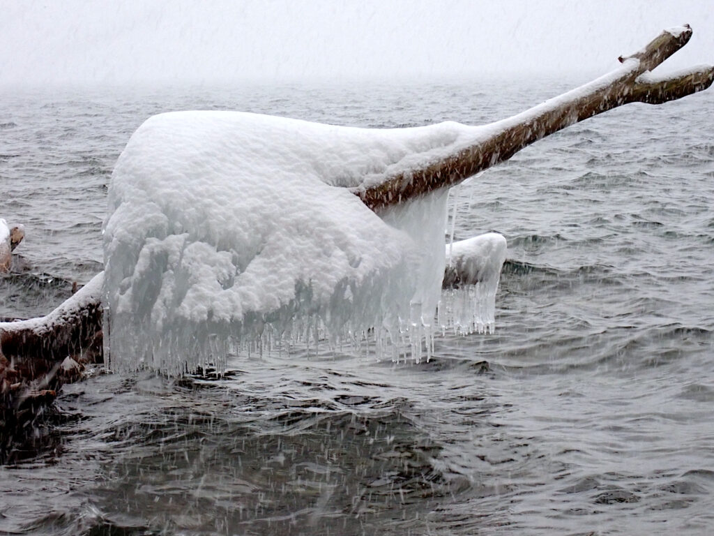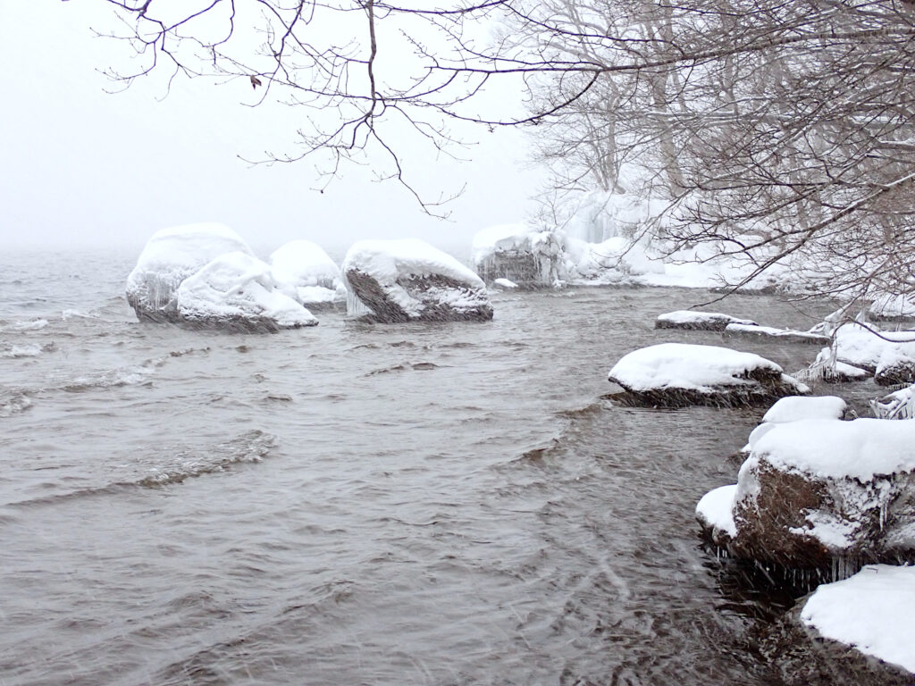 今朝8:00の気温はマイナス8度。湖畔のしぶき氷を見に行ってきました。