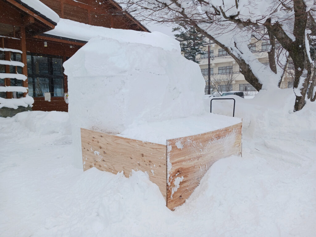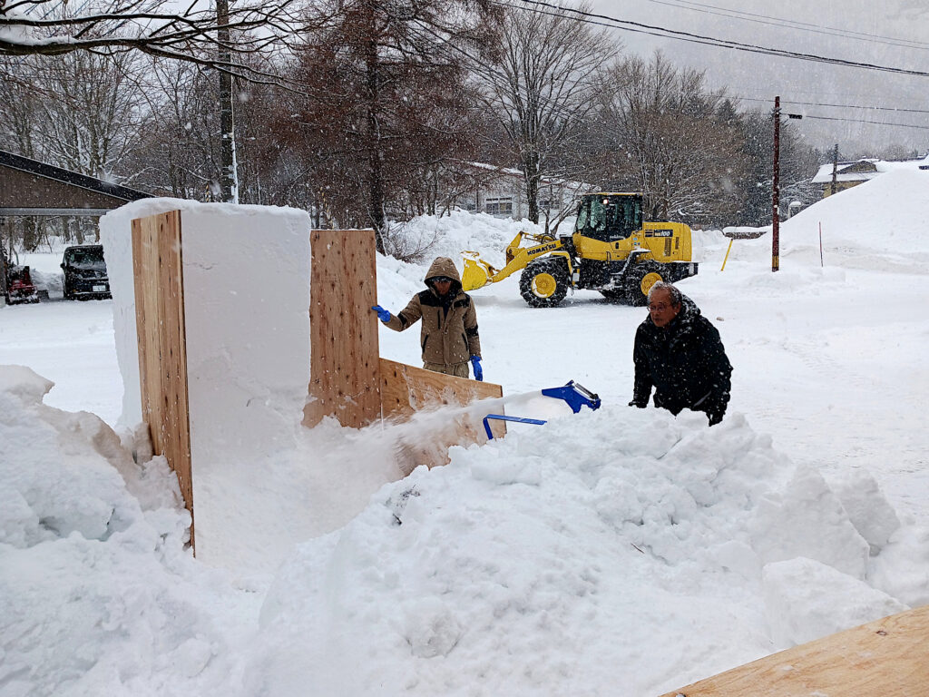 雪が固まったら板を外し、スコップで彫ったり、水雪を盛ったりして…